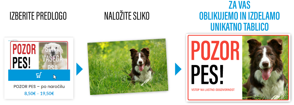 Izberite predlogo, naložite sliko vašega hišnega ljubljenčka vpišite ime psa nato pa vam jo oblikujemo in pošljemo v pregled. Po potrditvi izgleda vam tablico izdelamo in pošljemo po pošti na vaš naslov.